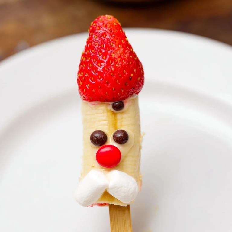 - Onto each skewer thread in order one large marshmallow for beard one banana round for face one strawberry pointed side up for Santas hat and top with a mini marshmallow pom-pom for Santas hat
