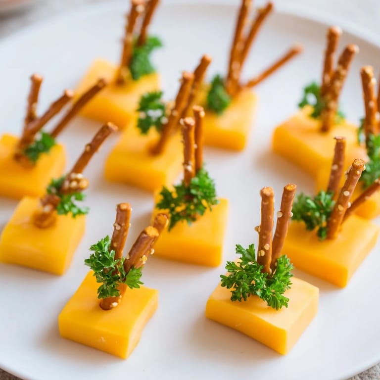 Save to Pins A festive, bite-sized party snack featuring sharp cheddar cheese cubes skewered on crispy pretzel sticks, perfect for ringing in the New Year.