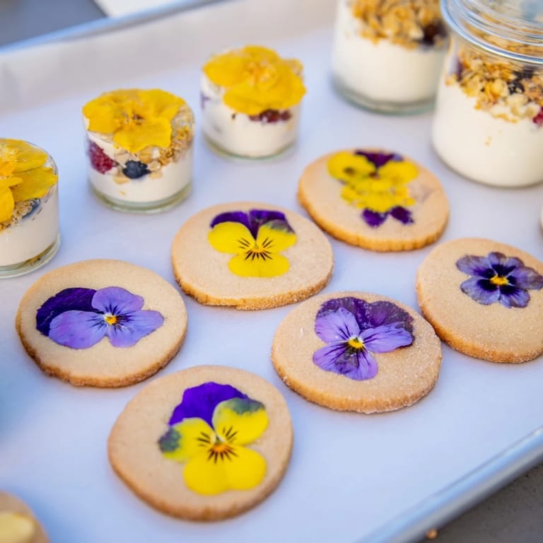 - Edible Flower Shortbread Cookies: 1 cup (225 g) unsalted butter softened, 2/3 cup (80 g) powdered sugar, 2 cups (250 g) all-purpose flour, 1/4 tsp salt, 1 tsp vanilla extract, 1/4 cup assorted edible flowers (e.g., violets, pansies, nasturtiums)