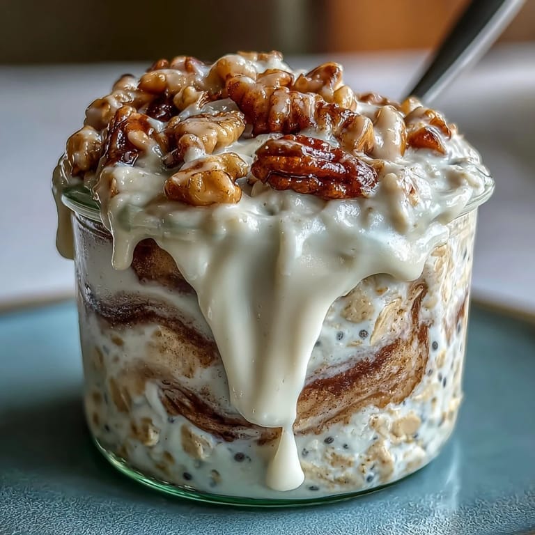 While these oats are delicious on their own, adding a topping of chopped walnuts or pecans provides a delightful crunch that mimics the texture of a classic cinnamon roll. Serve chilled directly from the jar or transfer to a bowl for a more formal breakfast. This recipe yields two servings, making it ideal for shared meals or multi-day prep.